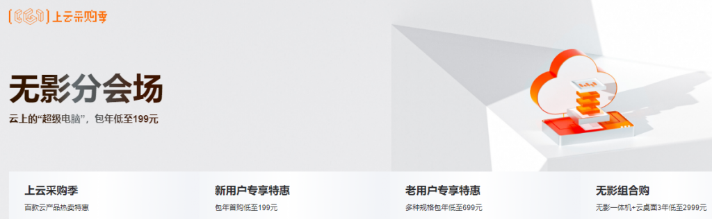 百款云产品热卖特惠,新用户首购低至1元起,购1元试用更享199/年包年新购或续费1次。老用户专享特惠多种规格包年低至699元。无影一体机+云桌面3年低至2999元。点此进入阿里云2023上云采购活动无影分会场