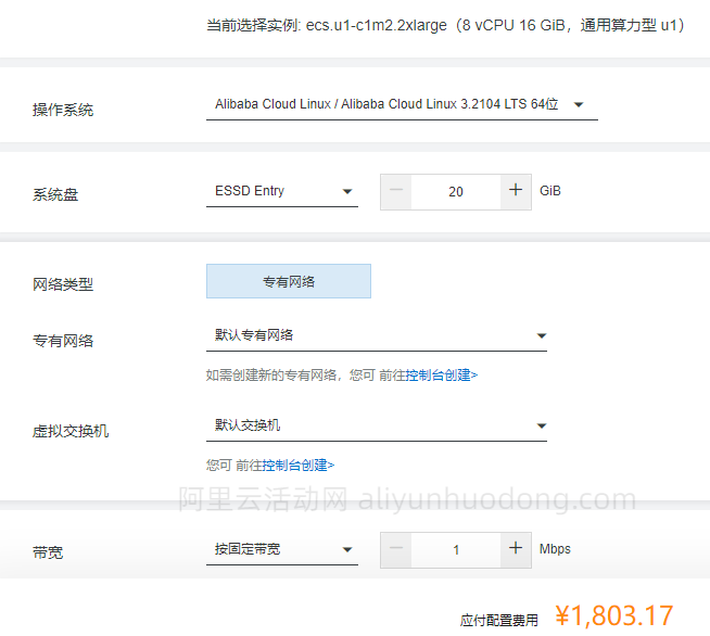 - 通用算力型u1实例:8核16G,1-5M带宽,20G ESSD Entry云盘,最低活动价格1051.85元/6个月、1803.17元/1年;