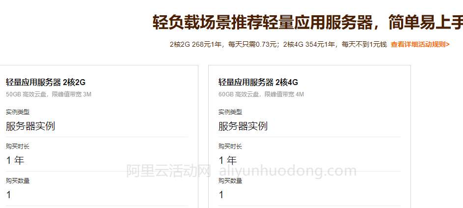 | 轻量应用服务器 | 2核4G | 60GB ESSD云盘 | 4M | 298元/1年 |