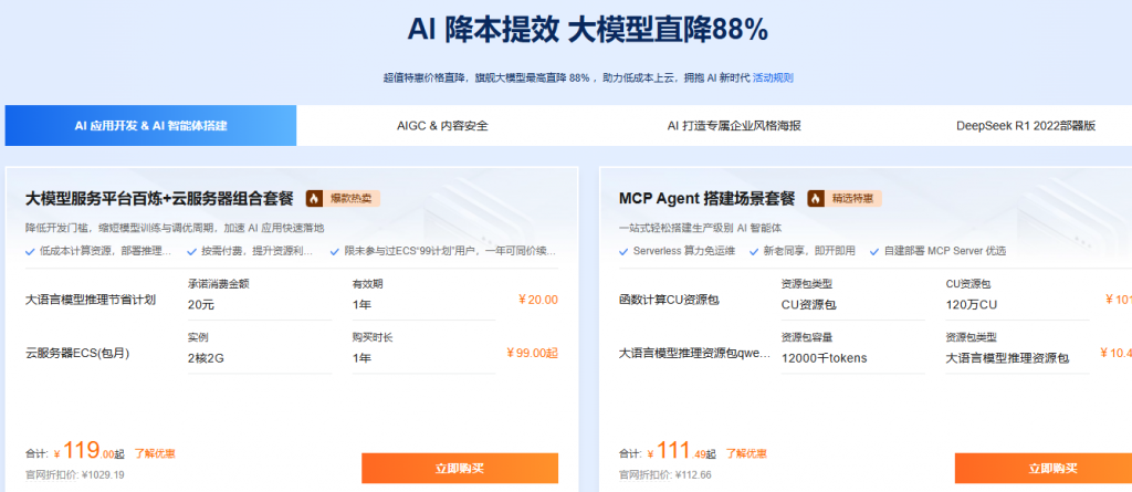 超值特惠价格直降,旗舰大模型最高直降 88% ,助力低成本上云,拥抱 AI 新时代。云小站平台为大家提供的AI产品组合套餐包括AI 应用开发 & AI 智能体搭建、AIGC & 内容安全、AI 打造专属企业风格海报、DeepSeek R1 2022部器版。