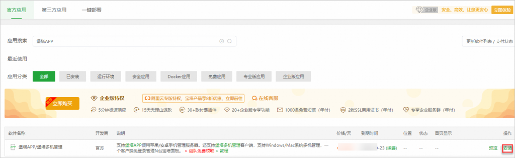 - 在应用搜索区域输入堡塔APP搜索软件,即可看到软件已经可以免费安装,单击安装,根据界面提示完成安装操作。