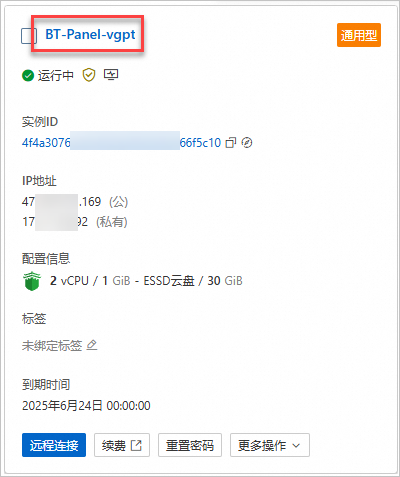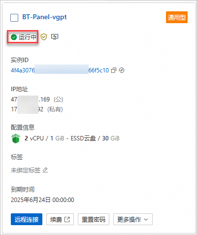 支付完成后,单击进入管理控制台。当服务器状态由准备中变为运行中,表示宝塔Linux面板已经部署成功。如下图所示: