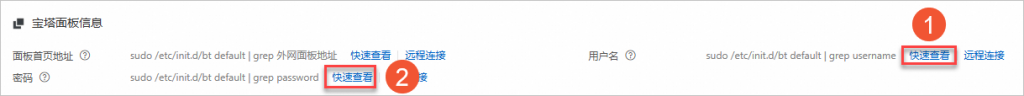 2.单击应用详情页签,在宝塔面板信息区域,依次单击快速查看,获取宝塔面板的用户名和密码。
