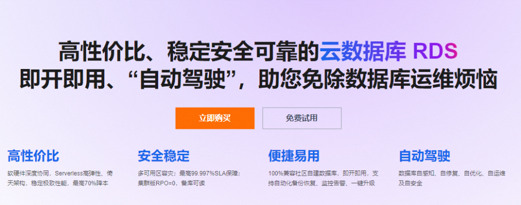 小结:阿里云的云数据库RDS以其丰富的产品线和全面的功能特性,成为了众多用户上云的首选之一。无论是RDS MySQL、RDS SQL Server还是RDS PostgreSQL,都提供了从基础管理到高级功能的全方位支持,满足了不同场景下的数据库需求。同时,阿里云还为用户提供了灵活多样的计费方式,包括包年包月、按量付费等,以及存储压缩、高性能云盘Buffer Pool Extension等增值服务,进一步降低了用户的上云成本。此外,阿里云不断推出的优惠活动和组合套餐,更是为用户提供了极具性价比的上云方案。因此,对于正在考虑上云或优化云数据库方案的用户来说,阿里云的云数据库RDS无疑是一个值得深入了解和考虑的选择。