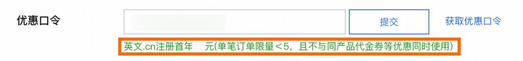 若当前存在域名注册优惠活动,则相关域名注册优惠口令将不生效。请关注阿里云域名注册首页以获取最新优惠信息。