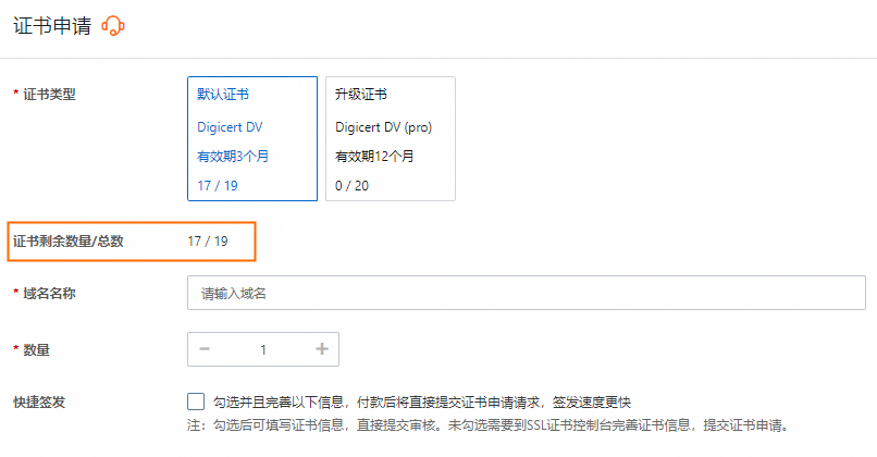 登录SSL证书管理控制台→选择"免费证书"标签页→点击"创建证书"查看剩余额度(如17/19表示剩余17张/总额度19张)。