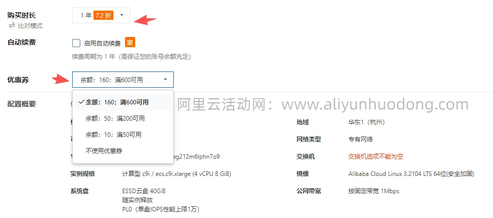 这里小编以选择一台包年包月模式计算型c9i实例,4核8G配置,1M带宽为例,在选择好地域、实例规格、镜像、带宽等配置之后,首先系统会根据购买时长自动给我们一个7.2折的折扣(选择不同实例规格和时长,折扣不一样),同时系统还会根据我们的订单金额自动匹配可叠加使用的优惠券金额,如下图所示:
