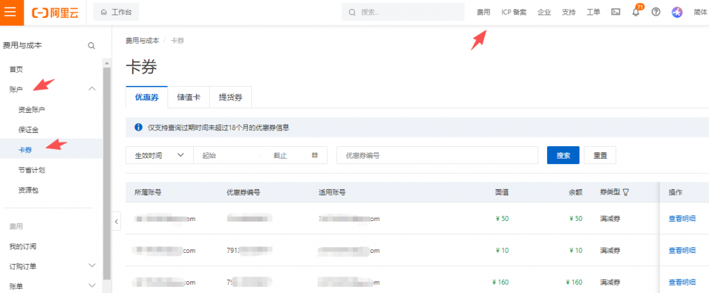 在控制台>费用>账户页,可以看到卡券,您可以在此查看全量代金券和优惠券的编号、面值、余额、适用产品、金额限制、状态、生效/失效时间等信息。如下图所示: