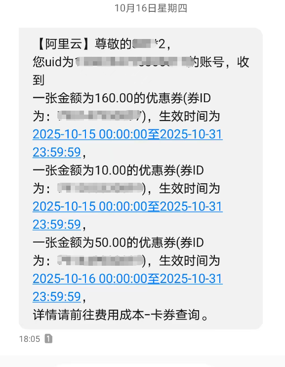 2025年阿里云针对部分用户不定期赠送各种优惠券,例如针对老用户目前就有160元、50元和10元的优惠券,此优惠券不需要我们领取或申请,系统自动赠送,赠送之后我们会收到短信和邮件通知,如下图所示:
