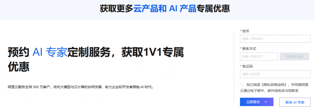 预约 AI 专家定制服务,获取1V1专属优惠,阿里云服务全球 500 万客户,依托大模型与云计算的协同发展,助力企业和开发者拥抱 AI 时代。