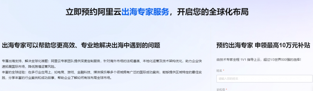 企业可通过阿里云出海专家服务预约系统启动全球化征程: