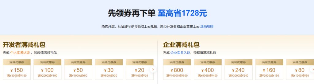 一旦企业完成认证,即可参与领取这份诚意满满的上云礼包,为企业的普惠上云之路添砖加瓦。这份企业礼包内藏6张满减券,面向所有在阿里云注册并完成企业实名认证的企业用户敞开大门。具体满减券信息如下: