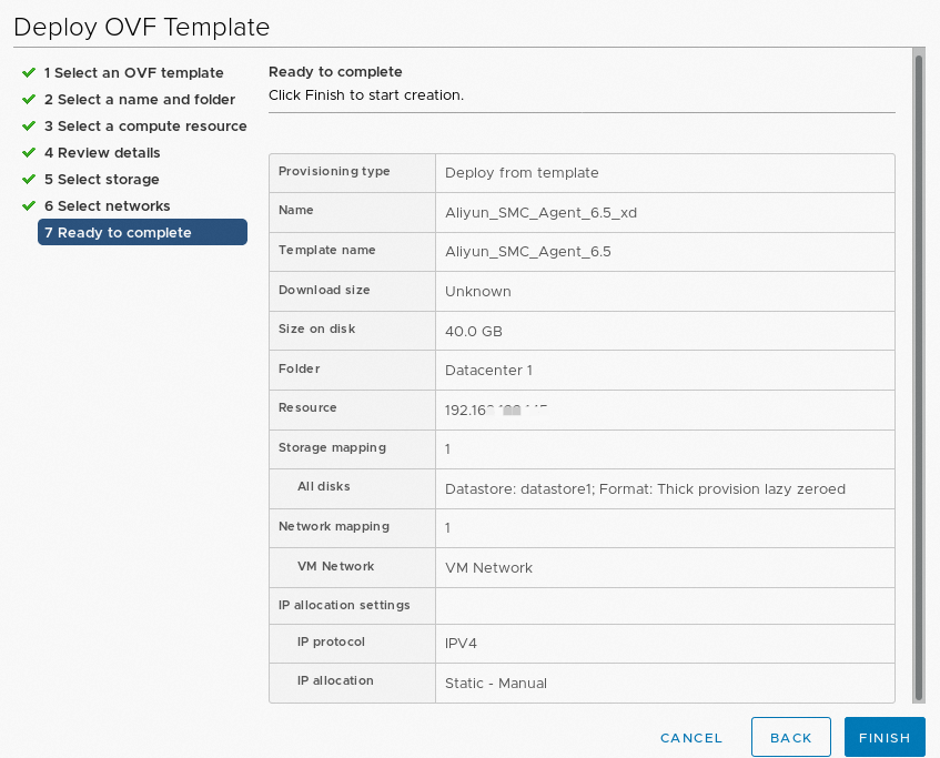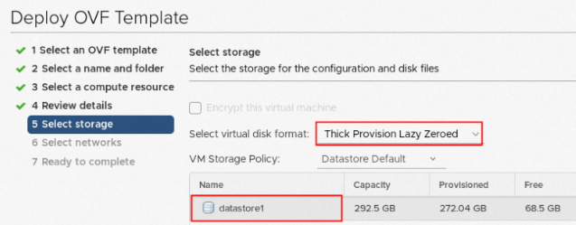 - 在Deploy OVF Template页面,根据配置向导完成创建虚拟机。