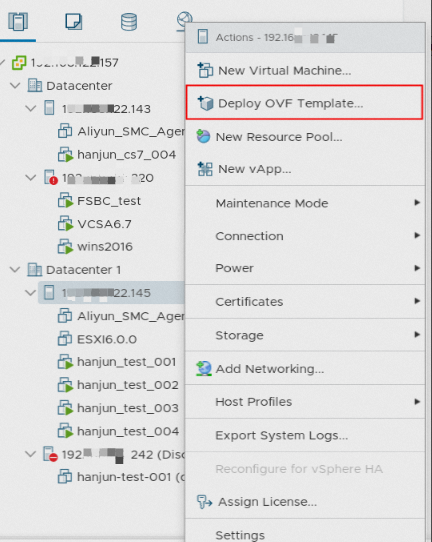 - 登录vCenter,在vCenter主机上,右键单击Deploy OVF Template...。