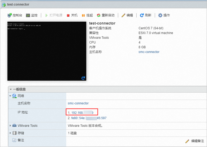 等待虚拟机部署完成,在一般信息区域中显示出连接器的IP地址(连接器的网络配置默认为DHCP,如需修改请自行配置)。