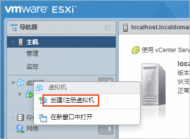 - 登录VMware ESXi,在虚拟机上右键,单击创建/注册虚拟机。