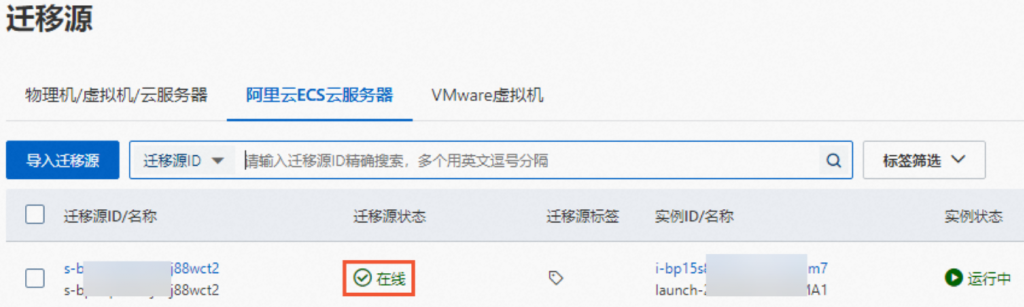 导入迁移源大约需要3~10分钟,请耐心等待。当迁移源状态由导入中变为在线,表示导入迁移源成功。