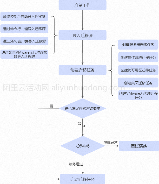 使用SMC进行迁移时,需先导入迁移源,然后创建并启动迁移任务,完成迁移操作。迁移流程如下图所示。