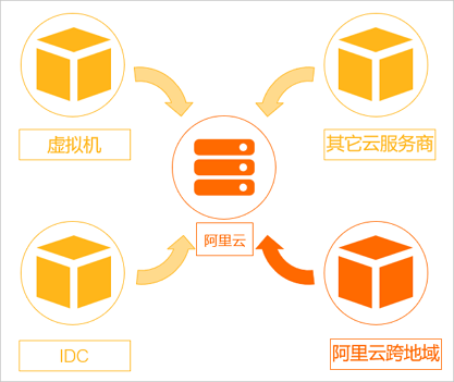 - 支持将源服务器从自建IDC机房、本地虚拟机(VMware、VirtualBox、Xen、KVM、Hyper-V等)、其他厂商云迁移至阿里云。