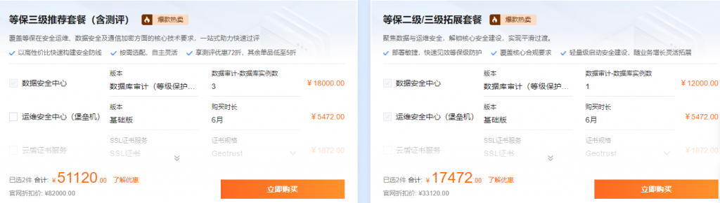 阿里云已服务超1000家企业通过等保二级/三级测评,提供从合规咨询到技术落地的全流程支持。等保二级套餐包含云防火墙、WAF、云安全中心、堡垒机、SSL证书、数据安全中心六大核心产品,原价17.8万元,活动期间享专属折扣;等保三级基础套餐新增数据库审计模块,总配置费用21.4万元,支持跨可用区部署及7×24小时应急响应。