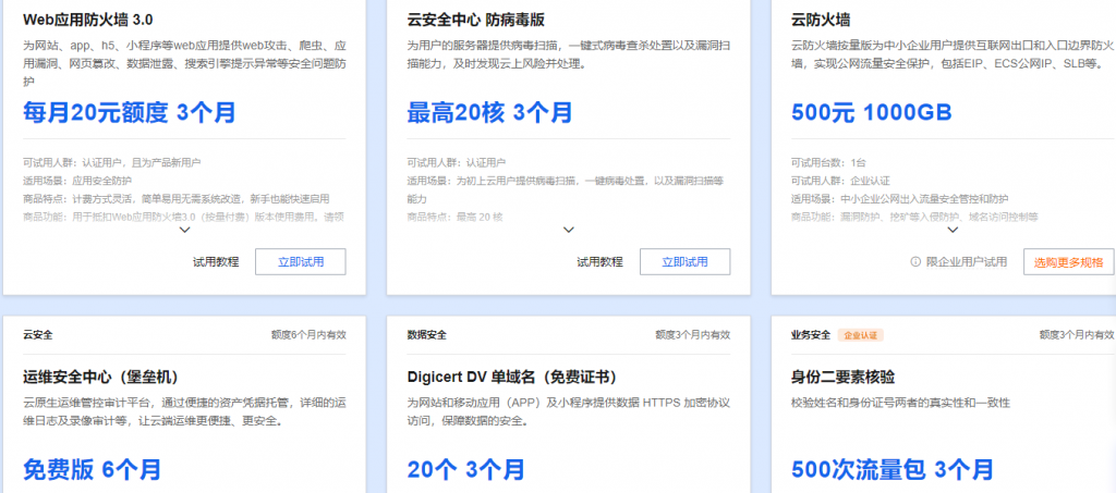 - 安全产品:云安全中心企业版提供7天免费试用,包含主机安全、容器安全、应用防护等全功能;Web应用防火墙3.0支持月付20元额度,适配应用层攻击防护。