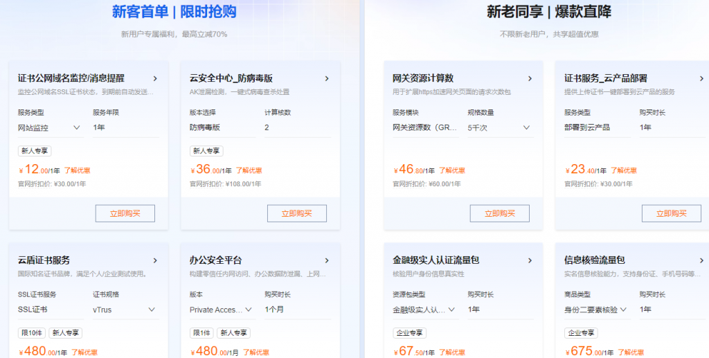 - 安全全家桶:云防火墙+WAF+云安全中心年费套餐直降20%,支持攻击防护、漏洞修复、安全审计一体化管理。