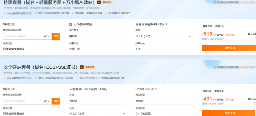 一个套餐配齐,安全建站,省心特惠。特惠套餐(域名+轻量服务器+万小智AI建站)519.00元/首年起;安全建站套餐(域名+ECS+SSL证书)431.50元/首年起;特惠建站套餐(域名+云服务器 ECS+对象存储 OSS)109.00元/首年起。