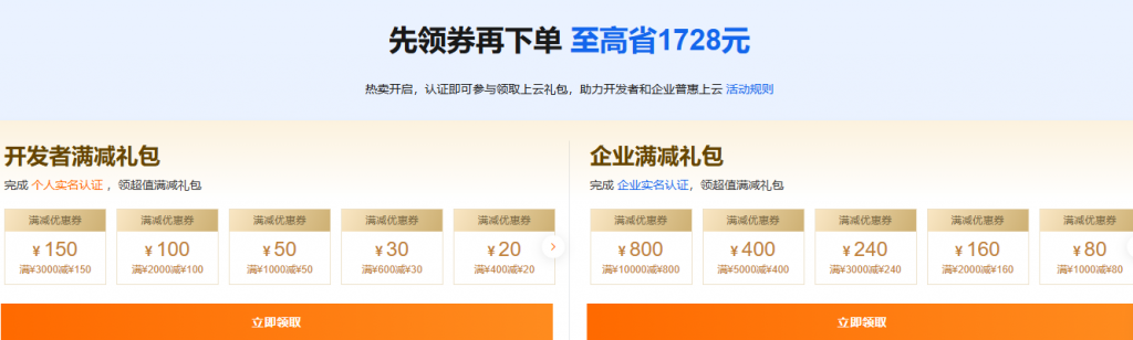 折扣券下面还有2025双11活动上云礼包,个人用户可领360元,单笔最高可减150元,企业用户可领1728元,单笔最高可减800元。