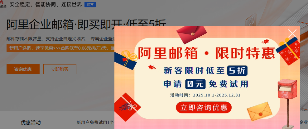 - 阿里云企业邮箱专属活动:https://www.aliyun.com/activity/purchasing/alimailnew