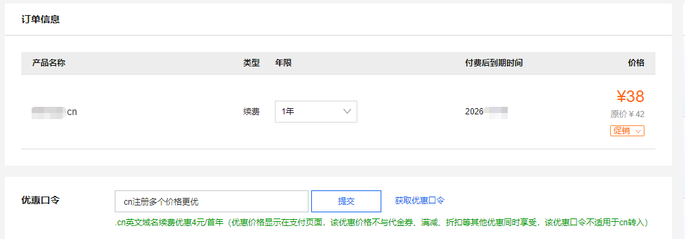 - 提交转入订单:在转入页面输入域名与转移密码,选择转入年限(支持1-10年)。
