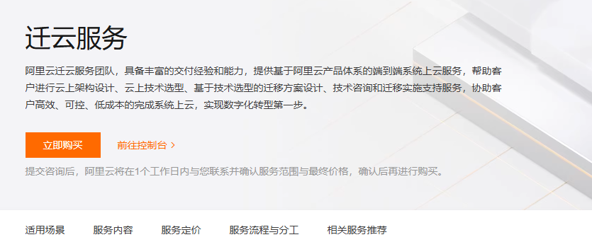 阿里云推出的迁云服务,是一项基于其全面产品体系的端到端系统迁移解决方案,旨在协助企业精准选择上云技术、设计云上架构、规划迁移及割接策略,以低成本、高效率的方式实现无缝上云体验。阿里云迁云服务团队,具备丰富的交付经验和能力,提供基于阿里云产品体系的端到端系统上云服务,帮助客户进行云上架构设计、云上技术选型、基于技术选型的迁移方案设计、技术咨询和迁移实施支持服务,协助客户高效、可控、低成本的完成系统上云,实现数字化转型第一步。