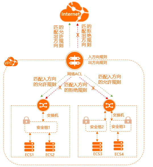 网络ACL(Network Access Control List)是专有网络VPC中的网络访问控制功能。用户可以自定义设置网络ACL规则,并将网络ACL与交换机绑定,实现对交换机中云服务器ECS实例流量的访问控制。用户可以同时使用ACL和安全组规则,分别对交换机和 ECS 的流量进行控制,以下是ACL与安全组的关系: