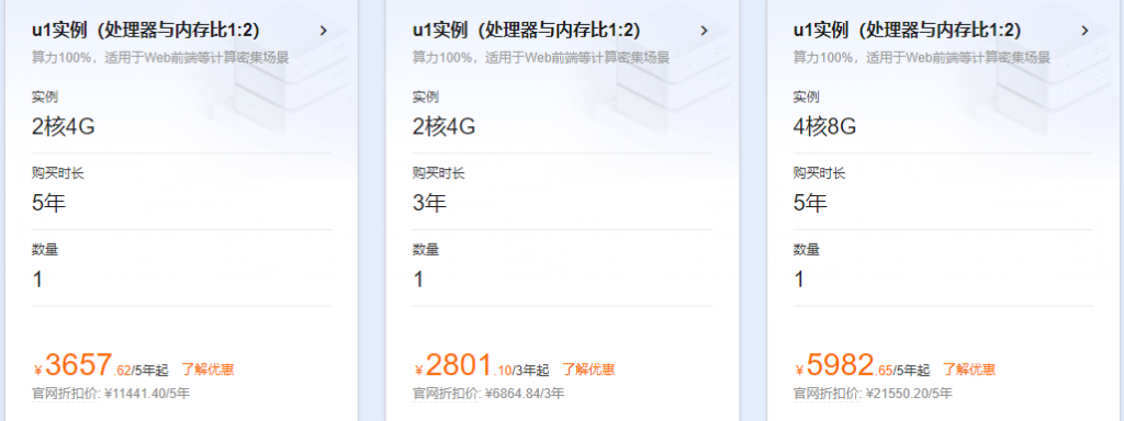 接着往下面看,在“精选云产品,助力一站式上云”即可看到u1实例2核4G、4核8G配置3年和5年特惠价,如下图: