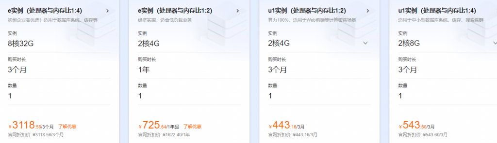 同时,平台内还有经济型e实例2核4G、8核32G配置以及u1实例2核4G、2核8G3个月特惠,如下图:
