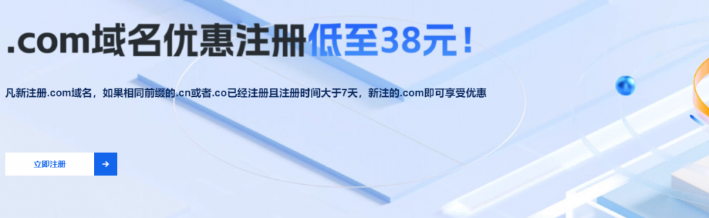 满足优惠注册条件,.com低至38元。凡新注册.com域名,如果相同前缀的.cn或者.co已经注册且注册时间大于7天,新注的.com即可享受优惠。活动链接:点此进入阿里云com优惠注册活动 链接打开如下图所示:
