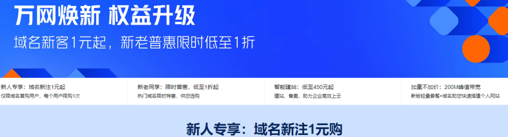 新人专享:域名新注1元起,仅限域名首购用户,每个用户限购1次。新老同享:限时普惠,低至1折起,热门域名限时特惠,供您选购。智能建站:低至450元起,建站、备案,助力企业高效上云。加量不加价:200M峰值带宽,新版轻量套餐+域名助您快速搭建个人网站。活动链接:点此进入万网焕新权益活动 链接打开如下图所示: