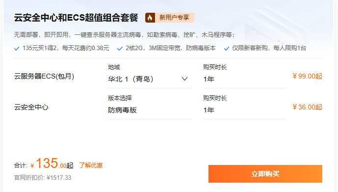 该套餐以135元的价格实现买1得2的优惠,平均每天花费约0.38元,就能享受到专业的安全防护服务。其配置为2核2G,3M固定带宽,防病毒版本,满足大多数用户的基本需求。在购买条件上,仅限新客新购,每人限购1台。云服务器ECS(包年)同样采用经济型e实例2核2G3M带宽,单品价格99.00元起;云安全中心防病毒版,单品价格36.00元/年。组合套餐价格仅为135.00元,性价比极高。