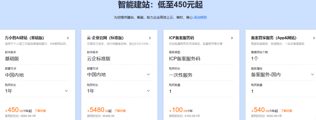 - 企业官网套餐:设计师定制建站7.9折,独立ECS+CDN加速,年费5480元起,支持备案智能助理。