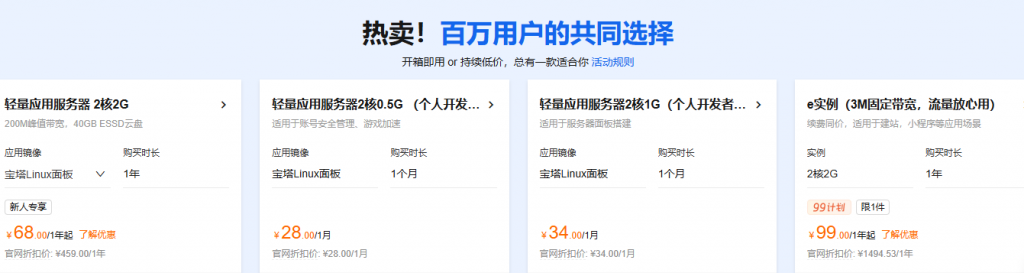 - 新用户专享活动报价:2核0.5G配置每月仅需28.00元;2核1G配置每月34.00元。