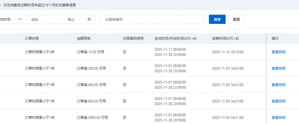 - 有效期:优惠券自领取之日起计算,有效期为 1 年。