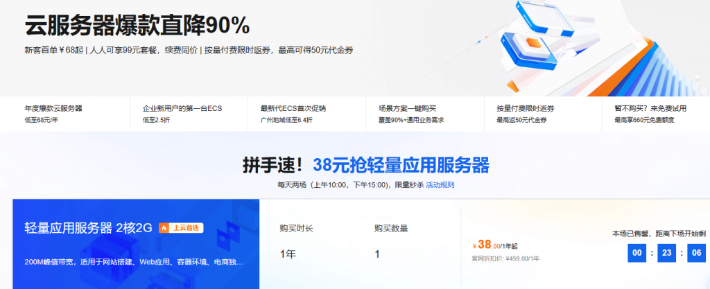 拼手速!38元抢2核2G200M峰值带宽轻量应用服务器,每天两场(上午10:00,下午15:00),限量秒杀。进入活动之后第一板块就是38元轻量应用服务器的抢购入口,如下图所示: