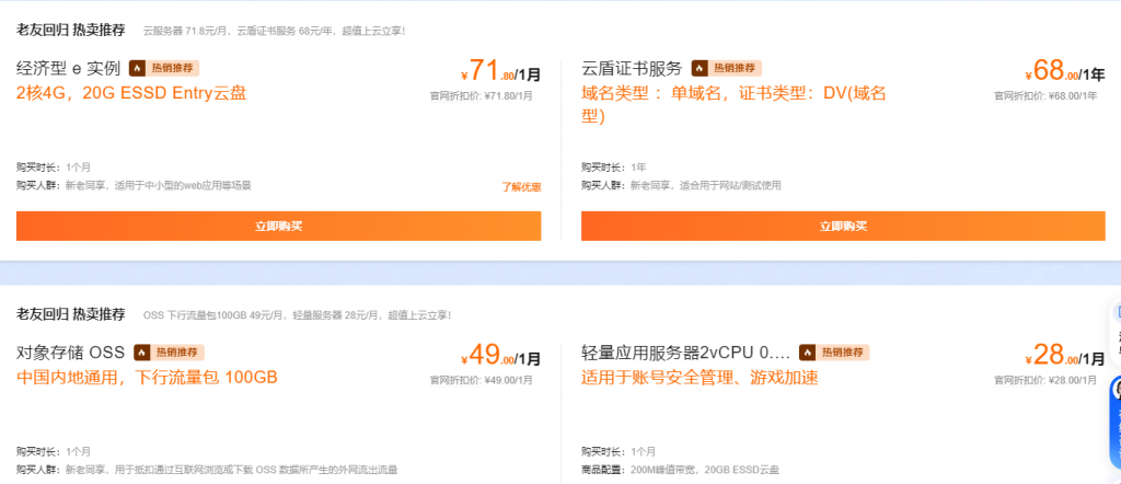 阿里云为回馈广大老用户,特别推出了一系列专享权益,让您以超值价格畅享云上服务。其中,轻量应用服务器仅需28元/月起,即可享受高达200M的峰值带宽以及20GB的ESSD云盘,无论是个人博客还是小型企业网站,都能轻松应对;云盾证书服务更是低至68元/年,为您的网站安全保驾护航;更有超值上云套餐,抢购即享2核2G云服务器76.9元/月的特惠价,开箱即用,完美适配中小型web应用,让您的业务快速上线,抢占市场先机。此外,「安全上云」SSL证书仅需303.75元/年,全面满足您对网站数据保护的高要求,性价比超绝,让您的每一分投入都物超所值。海量数据上云也变得更加经济实惠,低至9元/年的价格,配合低延迟、可扩展的特性,充分激发您的数据活力,助力业务飞速发展。