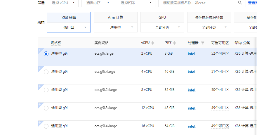 | 通用型g9i | 采用阿里云全新CIPU架构,搭载P-core(性能核)的英特尔® 至强® 6处理器,可提供稳定的算力输出、更强劲的I/O引擎以及芯片级的安全加固。 | 处理器与内存配比为1:4。 处理器:采用Intel® Xeon® Granite Rapids,主频3.2 GHz,全核睿频3.6 GHz,计算性能稳定。 | I/O优化实例。 支持NVMe协议。 支持的云盘类型:ESSD云盘、ESSD AutoPL云盘。 小规格实例云盘IOPS和云盘带宽具备突发能力(实例存储I/O性能与计算规格对应,规格越高存储I/O性能越强。 | 支持IPv4、IPv6。 支持ERI(Elastic RDMA Interface)。 支持巨型帧(Jumbo frames)。 实例网络性能与实例规格对应,规格越高网络性能越强。 |