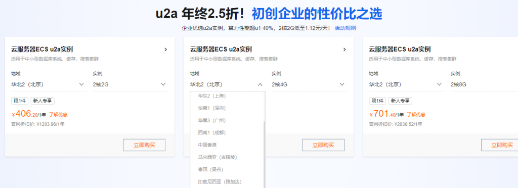 该活动是阿里云专门为新用户量身打造的一场优惠盛宴。在活动页面上,新用户可以自由选择通用算力型u2a实例云服务器,配置选择丰富多样,涵盖2核4G、4核8G、2核8G、4核16G等多种规格,充分满足不同用户在不同业务场景下的需求。同时,地域选择也十分广泛,不仅有国内的华东2(上海)、华南1(深圳)、华南3(广州)、西南1(成都)等地区,还涵盖了中国香港、马来西亚(吉隆坡)、泰国(曼谷)、印度尼西亚(雅加达)等海外热门地域,为用户拓展海外业务提供了便利。具体如下图所示: