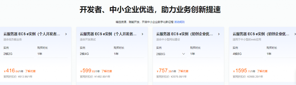 - 经济型e(ecs.e-c1m2.large):2核4G,1M - 5M带宽,40G ESSD Entry云盘,活动报价599.93元/1年/1M带宽、834.53元/1年/2M带宽、1089.53元/1年/3M带宽、1344.53元/1年/4M带宽、1640.33元/1年/5M带宽;