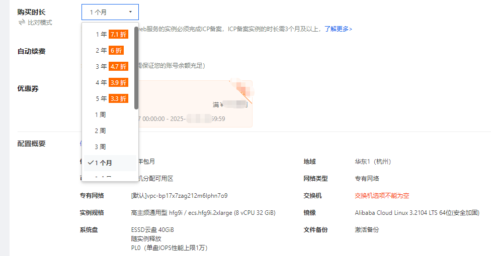 阿里云服务器价格通常由实例配置、带宽、云盘组成,特定情况下还包括镜像和快照费用。收费标准是指官方定价,真实购买价格往往要低于定价,一方面是因为阿里云经常会为不同的用户推出各种优惠券或者活动,另外一方面,阿里云系统会根据用户实际购买时长享受对应的优惠折扣,不同实例规格的云服务器根据选购时长的不同,折扣会不一样,例如小编选择了一款高主频通用型hfg9i实例8核32G配置的云服务器,可享受年付7.1折、2年付6折、3年付4.7折、5年付3.3折,而通常情况下选择1周、1个月等短期租用则没有折扣,如下图所示: