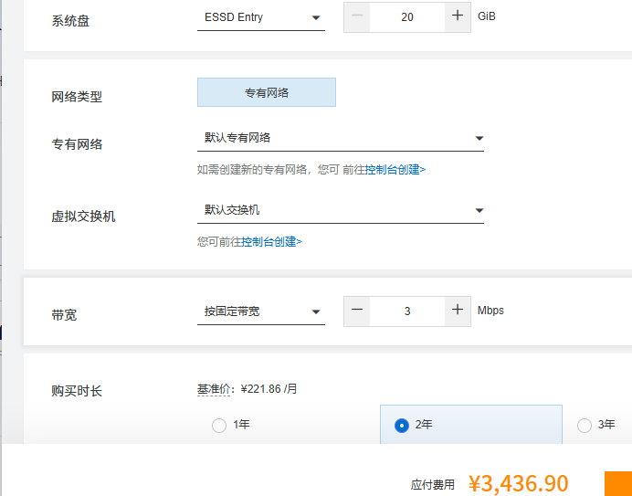 活动内默认展示的1个月或1年的价格,如果我们需要选择2年或3年,在实际购买的时候,购买时长这里选择2年或3年,并根据自己的需求选择好带宽,即可看到2年或3年的活动价格情况,例如经济型e实例4核8G3M带宽2年的活动价格为3946.90元,如下图所示: