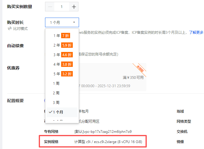 在我们通过云服务器ECS产品页面选择好所需云服务器的实例规格、配置、地域、镜像、带宽等配置之后,在最下面的购买时长这里可以查看所选实例1年到5年的具体折扣信息,例如目前计算型 c9i实例的折扣为1年7折、2年5.9折、3年4.6折、4年3.8折、5年3.2折,如下图所示: