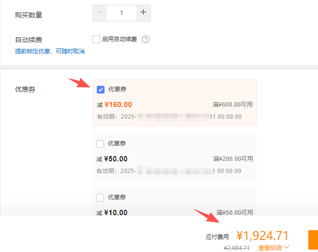 最后,系统会自动根据您的订单金额匹配可使用的优惠券种类及金额,我们只需勾选使用即可,由于订单金额已经满了600元,因此,小编这里可以使用160元的优惠券,实际价格就为1924.71元,如下图所示: