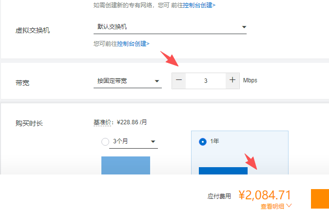 第三步:选择云服务器地域、可用区、镜像、系统盘之后,带宽选择3M,此时活动价格为2084.71元,如下图所示: